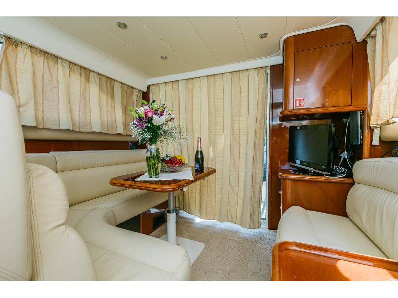 Die moderne und luxuriöse Inneneinrichtung unseres Jeanneau Prestige 36 zeichnet sich durch einen modernen und raffinierten Stil aus, wie es bei der französischen Werft üblich ist. Eine schöne Eignerkabine mit Doppelbett sowie eine Gästekabine mit zwei Einzelbetten, ein geräumiger Salon mit Pantry sowie ausreichend Liegen am Vordeck und Flybridge bieten viel Platz für kleine Familien oder zwei Paare.