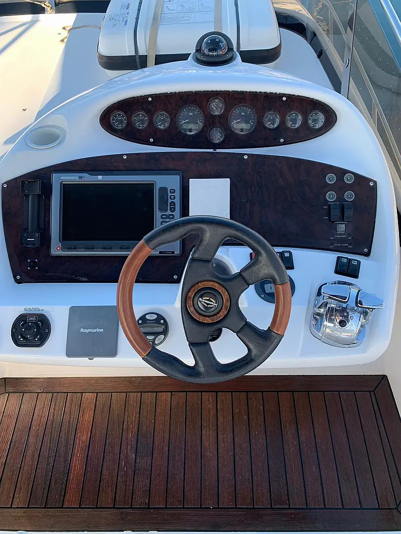 GPS / Plotter, Sitzgruppe mit Tisch auf Fly, Nasszelle mit Waschbecken, Schwerer Anker verzinkt, 50 Meter verzinkte Ankerkette, 2 Hebel Micro-Commander Schaltung (true), Generator (true), CD / USB Radio, Elektroherd 220V, Navigationssystem, Komplette Instrumentierung, Tiefenmesser (true), Elektrische Ankerwinsch, Sonnenliege auf Bug, Elektrische Toilette (true), Beiboot (true), Bimini Top (true), Waschbecken in Gästekabine, Flybridge (true), Klimaanlage (true), Tisch auf Fly (true), Bugstrahlruder, Zusätzlicher Kühlschrank (true), SAT TV, TV (true), Tisch im cockpit, Badeplattform, Badeleiter, Stauraum, Teak im Plicht, Trimmklappen, Teak on the Sideboard, Teak auf badeplatform