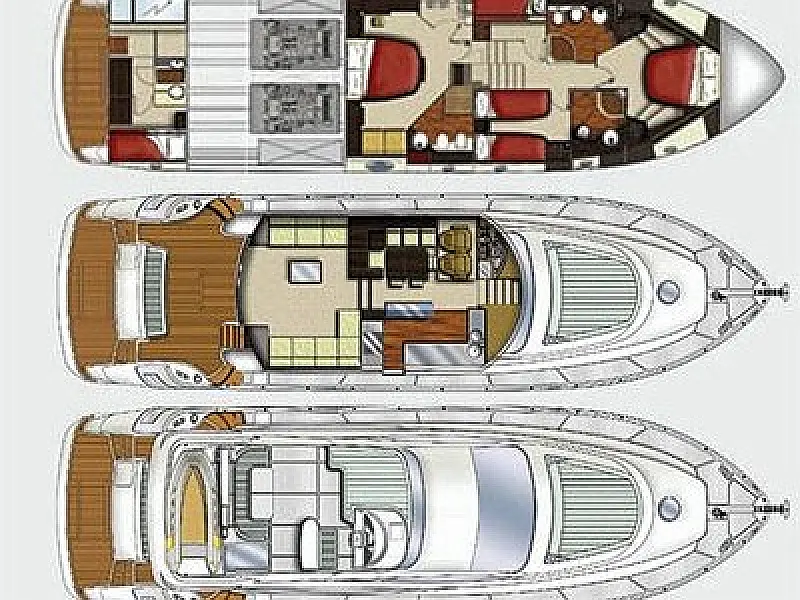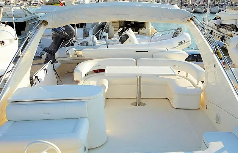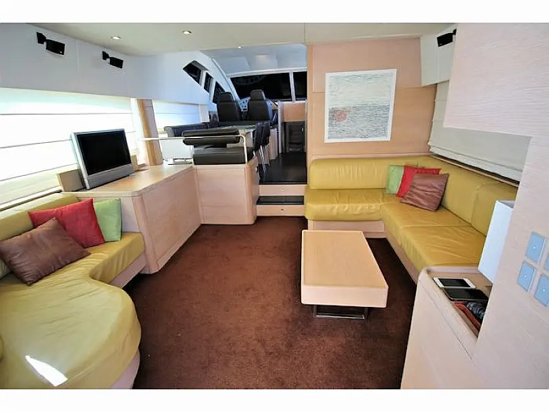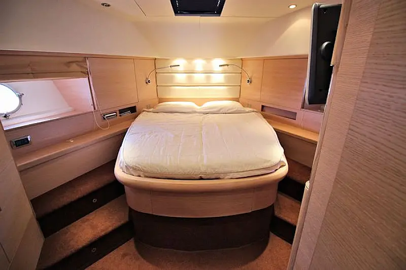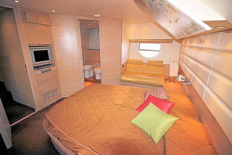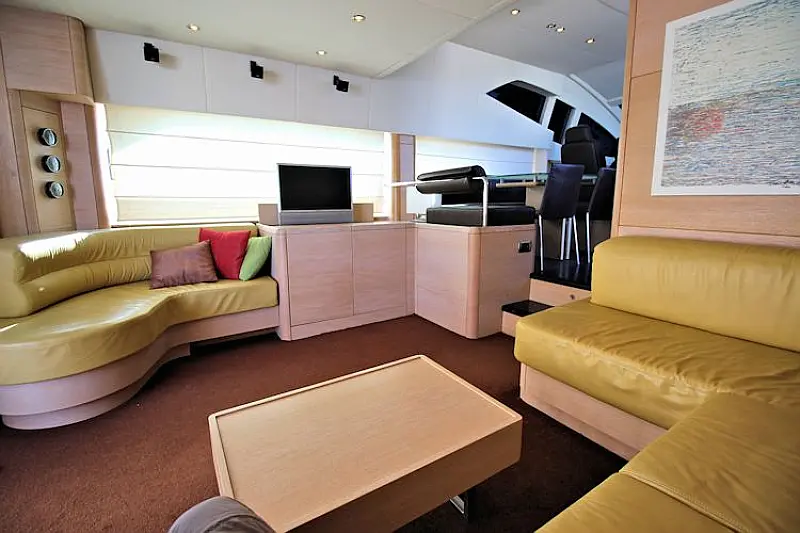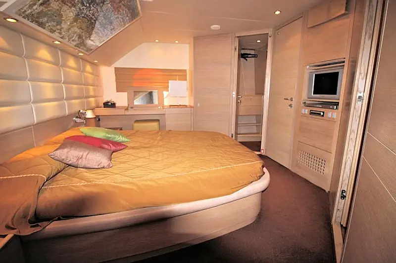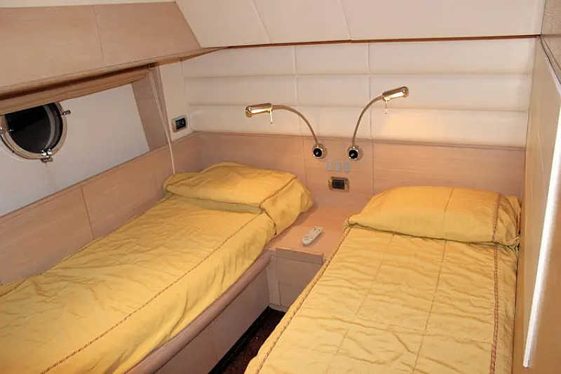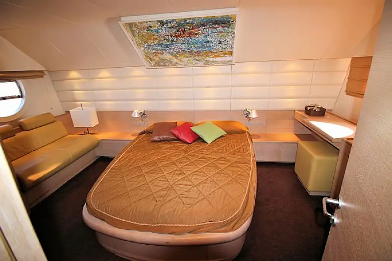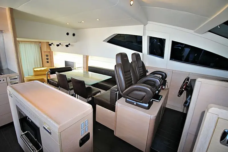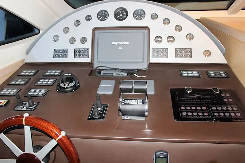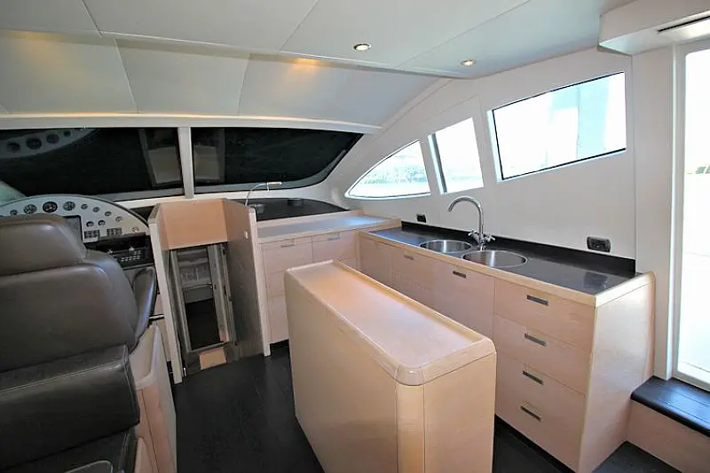 Stern shower, Autopilot Raymarine (true), Hydraulic gangway, Hydraulic dinghy crane (true), Bowthruster, Refrigerator on the flybridge, SAT TV, Stern thruster, Radar, Skipper cabin in the stern