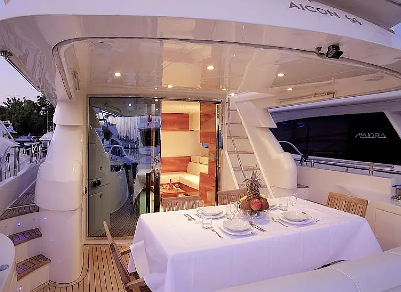 contemporary living. On board the Aicon 64 are straight lines coupled with plenty of space. All equipped with 4 double cabins with TV and stereo, 3 baths, oversized skipper cabin with