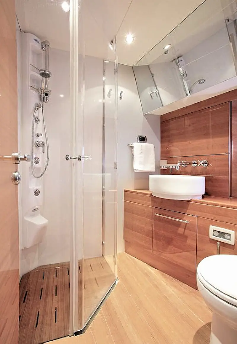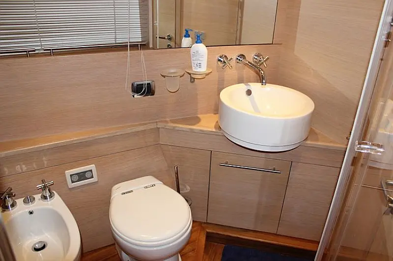 private bathroom from the bathing platform accessible, a 17KW generator strong, air conditioning (hot / cold) in all premises, bow and stern thruster, hydraulic dinghy crane winches for stern lines,