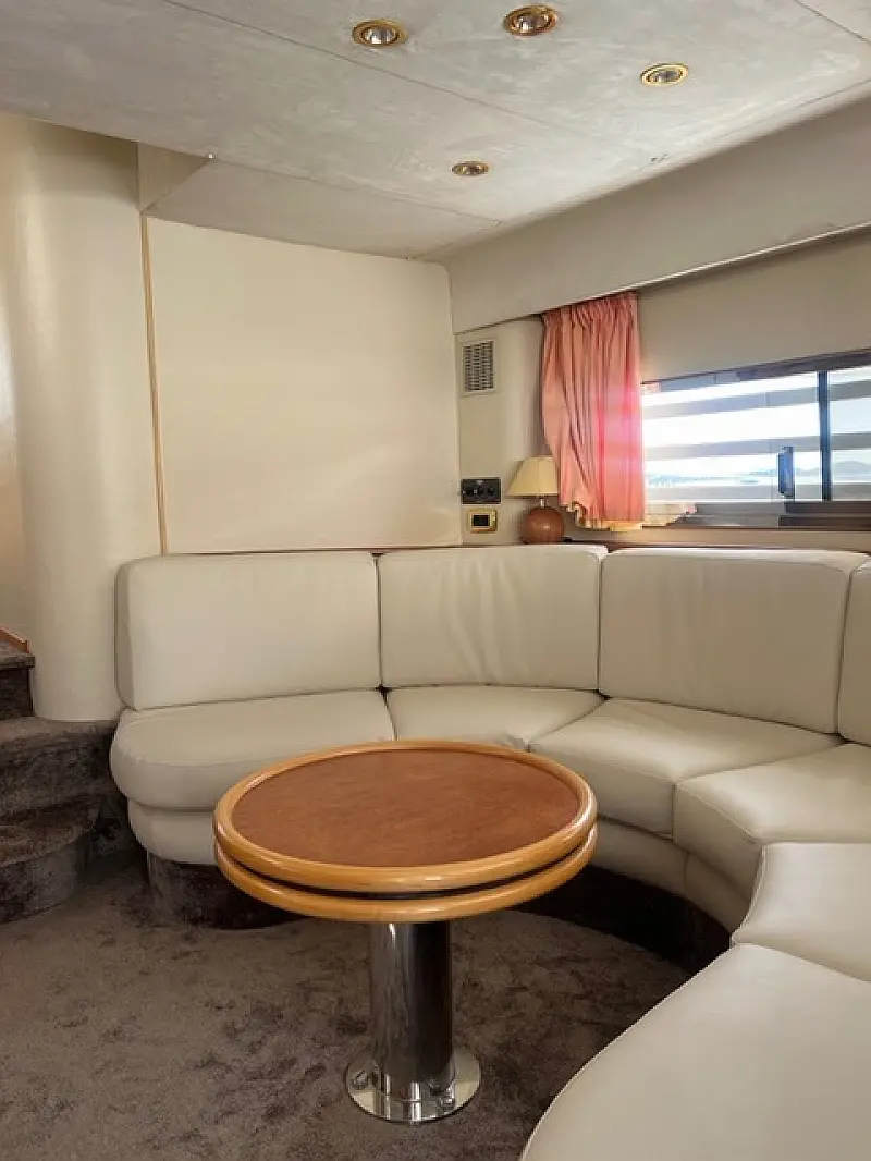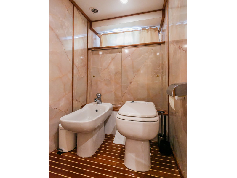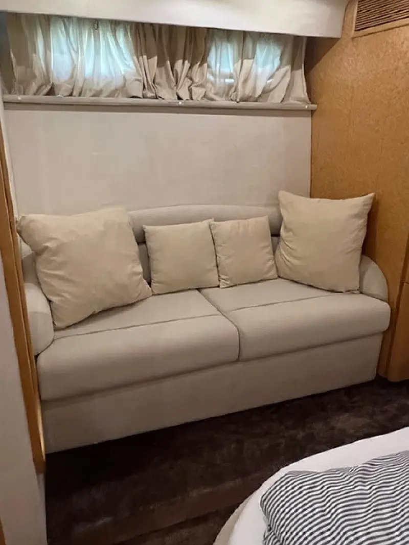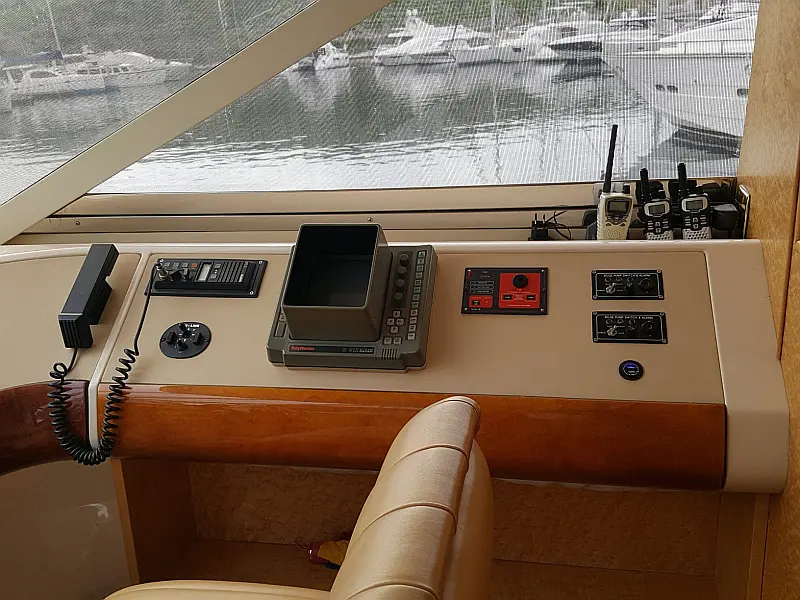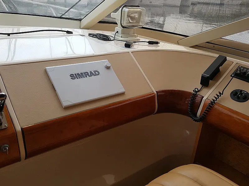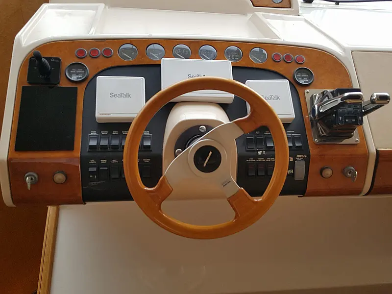 Complete Persenning, Skipper cabin in the bow, 80 m galvanized anchor chain (true), 4-stick gear, Complete instruments, Depth meter (true), Electric windlass, Sun lounge on the bow, Electric toilettes (true), Bimini top (true), Flybridge (true), Air condition (true), Bowthruster, Electric dinghy crane, Stern thruster, Bathing platform, Storage space, Skipper cabin in the stern