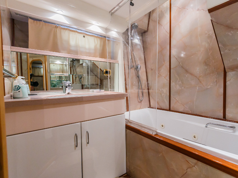 The 4 meter long dinghy equipped with 40 HP is located on an extra extended bathing platform. The bathroom has a tub with whirlpool function.
