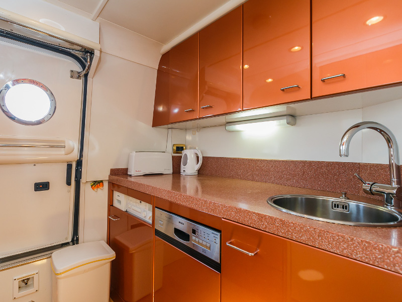 A watermaker always provides sufficient water. If you do not want to drive the yacht yourself, you can accommodate the skipper or another person in two separate skipper cabins.