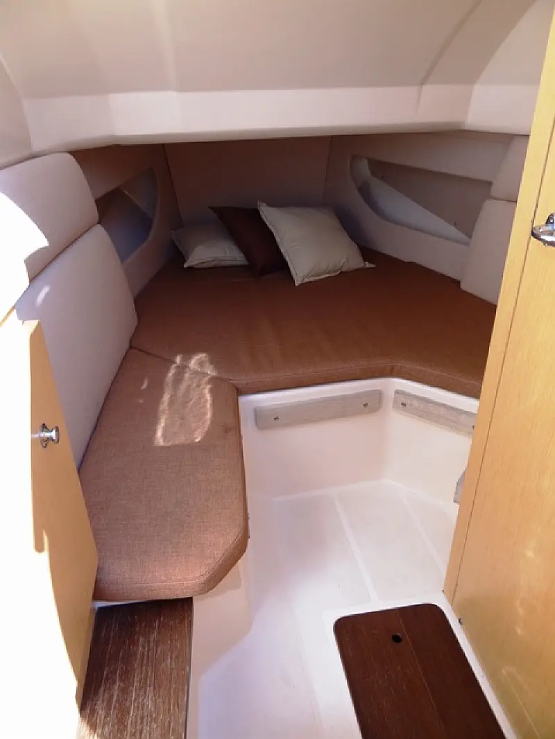Another bed with mattresses is at the bow of the speed boat. All walking surfaces are