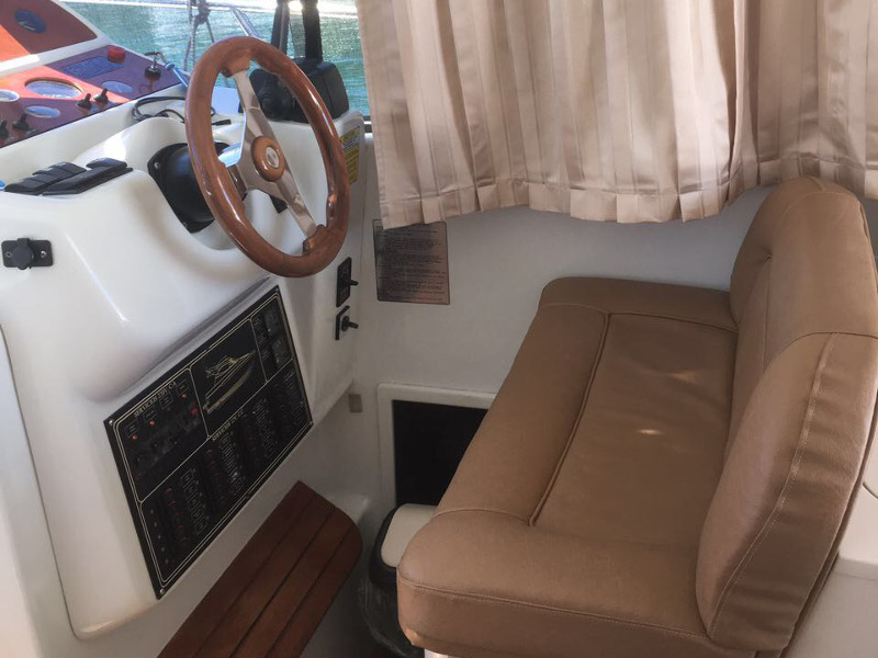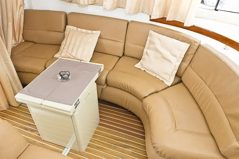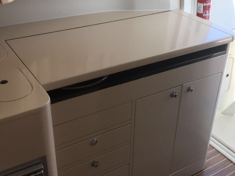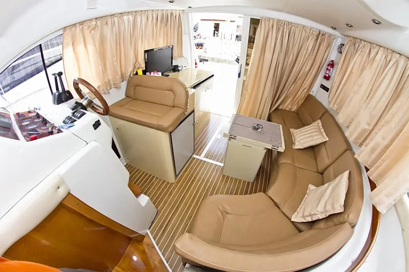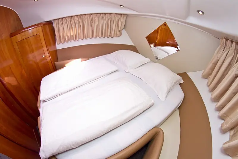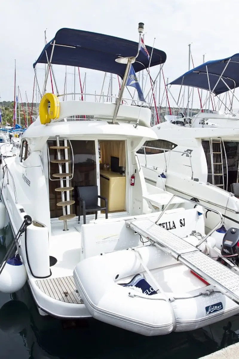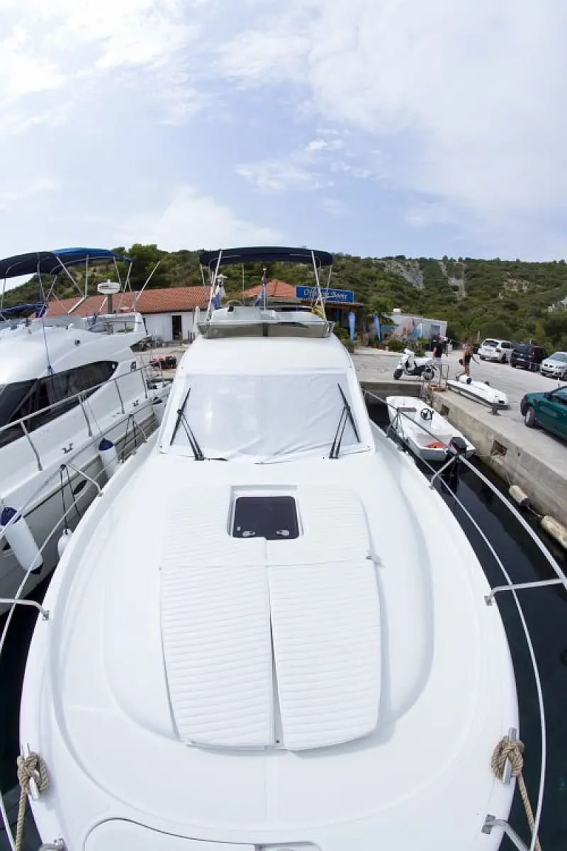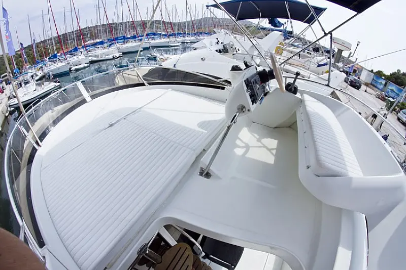Hydraulic gangway / dighy crane, Heavy anchor galvanized, 50 m galvanized anchor chain, 2-stick micro-commander gear (true), Refrigerator 12 V / approx. 60 l, Generator (true), CD / USB Radio, Electric stove 220V, Stern shower, Navigation system, Complete instruments, Depth meter (true), Electric windlass, Sun lounge on the bow, Electric toilettes (true), Internet Router WLAN, Wash basin in guest cabin, Flybridge (true), Sun lounge on the flybridge, Air condition (true), Bowthruster, Table in the cockpit, Bathing platform, Storage space, GPS Navicom RT-450 DSC