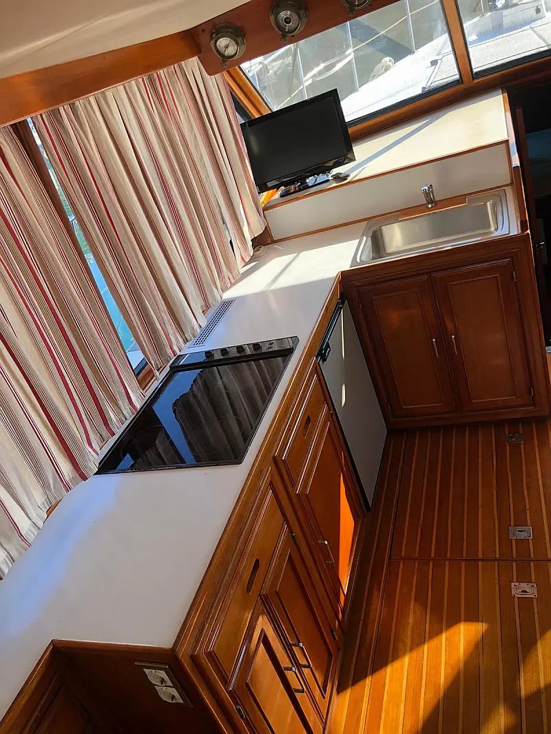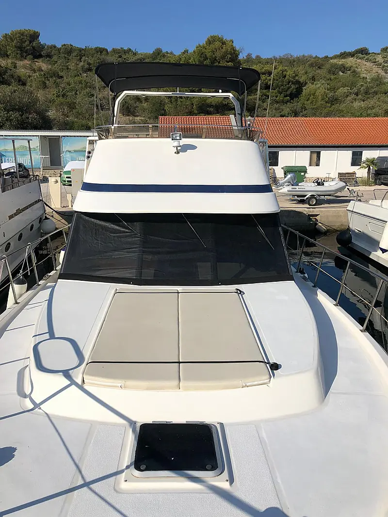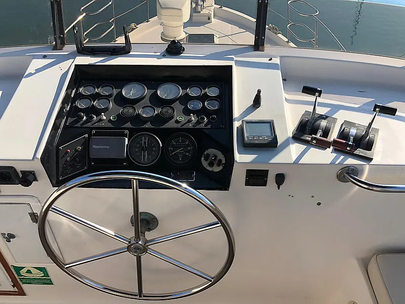 Complete Persenning, Additional refrigerator in the cockpit, Refrigerator 12 V / approx. 120 l, Heavy anchor galvanized, 50 m galvanized anchor chain, Hardtop over the cockpit, 2-stick micro-commander gear (true), Generator (true), TV with DVD/hard disk, CD / USB Radio, Electric stove 220V, Stern shower, Navigation system, Complete instruments, Depth meter (true), Autopilot Raymarine (true), Electric windlass, Hydraulic gangway, Sun lounge on the bow, Hardtop (true), Refrigerator and wetbar in the cockpit (true), Electric toilettes (true), Internet Router WLAN, Side door to the gangboard, Flybridge (true), Electric dinghy crane, Ice maker, Wet bar in the cockpit, Storage space, Seating area on the flybridge, Teak on the flybridge, Teak im Cockpit, GPS Fly Lowrance HDS7m, Flaps, Teak on the Sideboard, Teak on the badeplatform